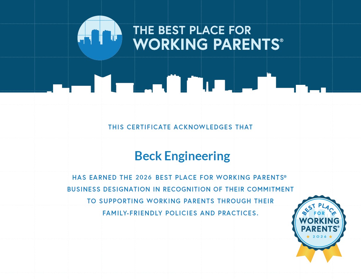The 2026 Best Place for Working Parents program recognized Beck Engineering, Inc. for our commitment to supporting working parents through family-friendly policies and practices.